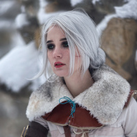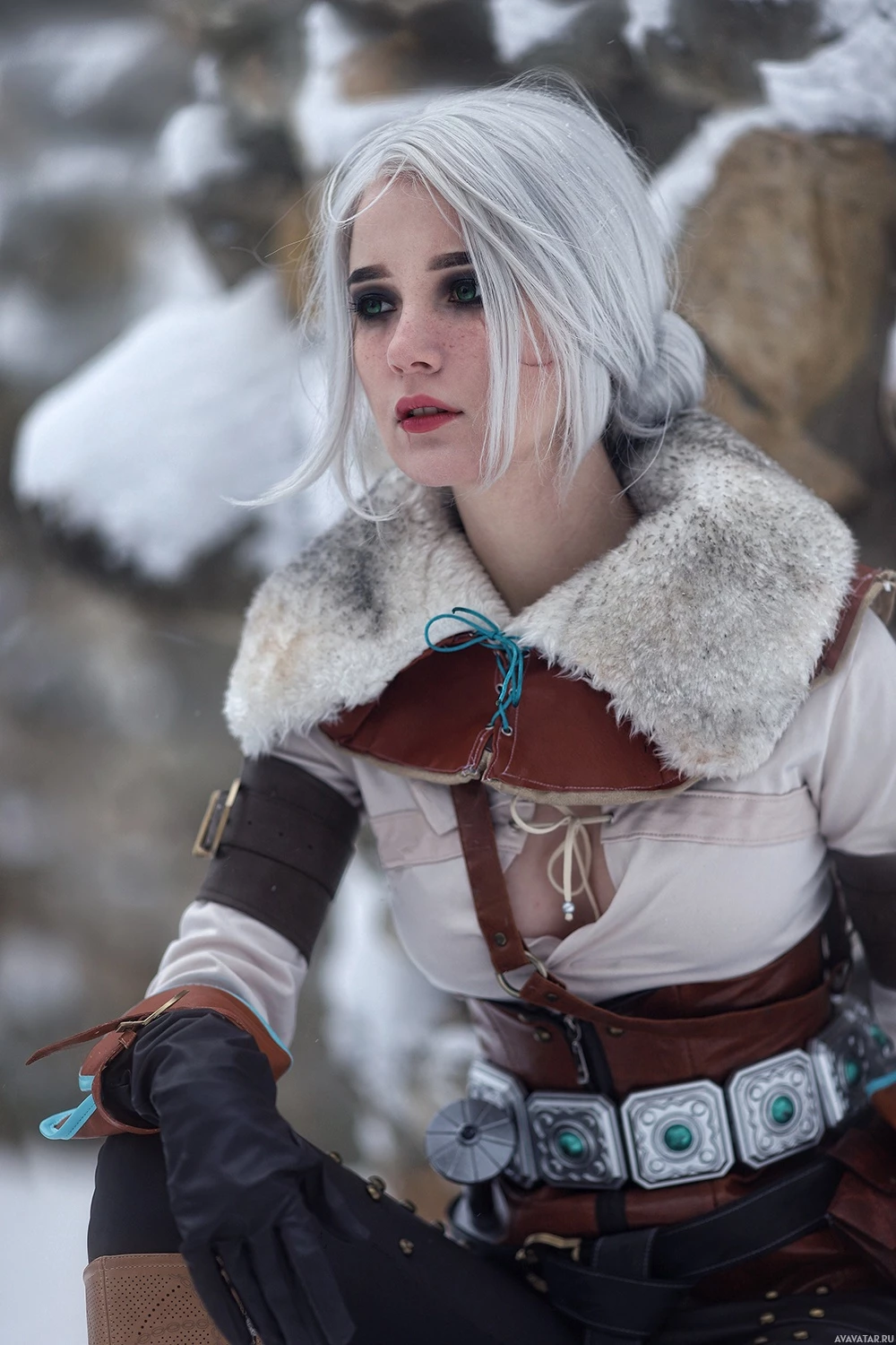 Wild Hunt" game. The individual is wearing costume elements that are characteristic of Ciri's appearance in the game, such as a fur-lined coat and armor with