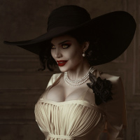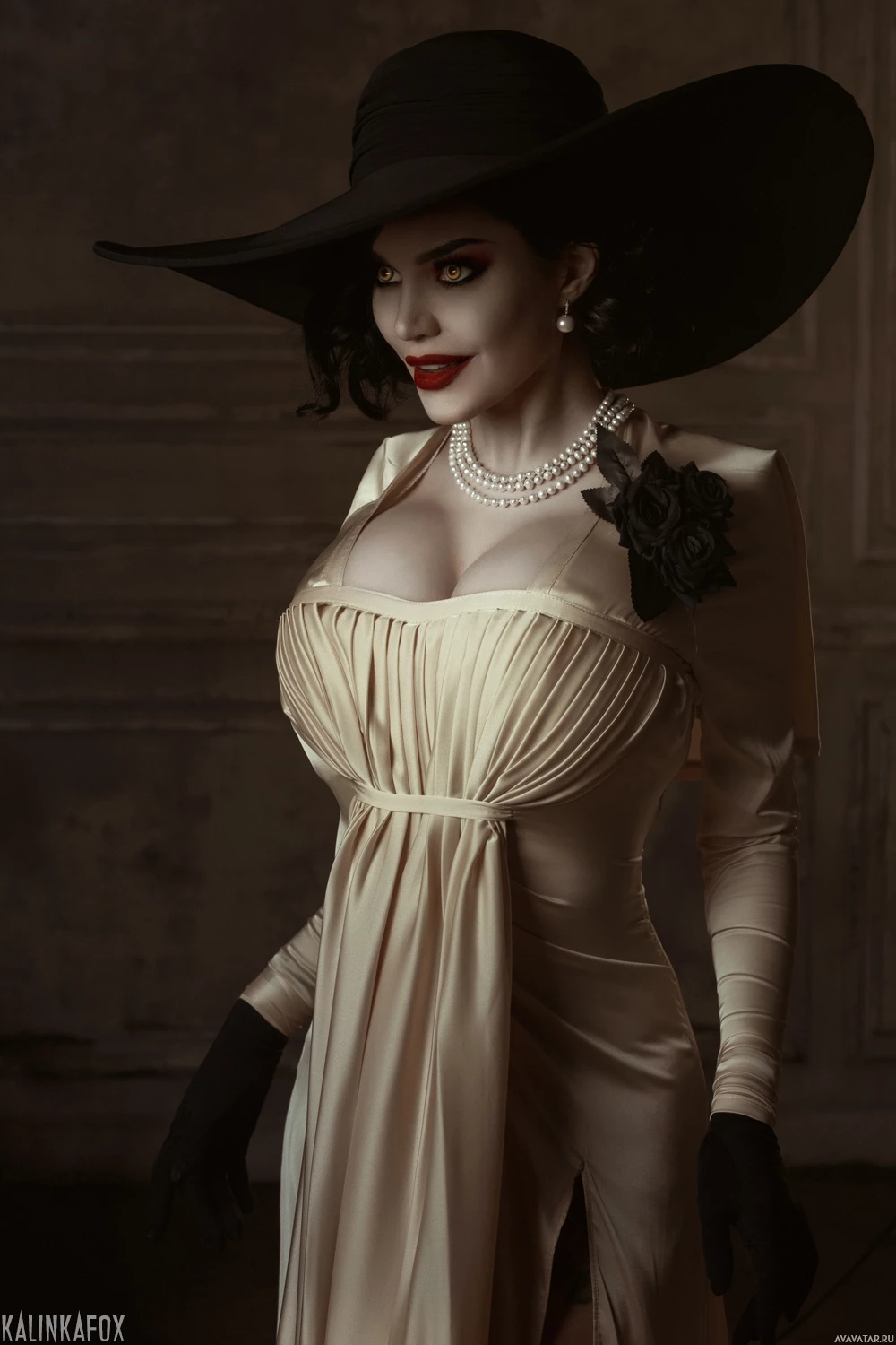 The image shows a person dressed as Lady Dimitrescu, a character from