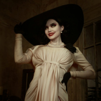 Resident Evil. The individual appears to be wearing a long, flowing dress with a wide brim and a high neckline, accessorized with