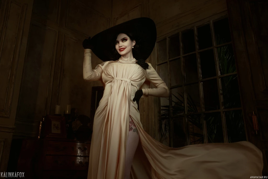 In the image, there is a person dressed in a costume that resembles Lady Dimitrescu from the game