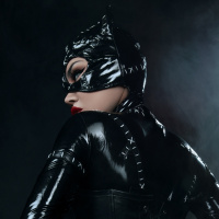 the Black Cat costume from comics or movies. They are standing with one hand on their hip and the other holding what appears to be a whip or similar prop. The background has a moody lighting with a hazy, almost smoky effect that creates