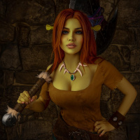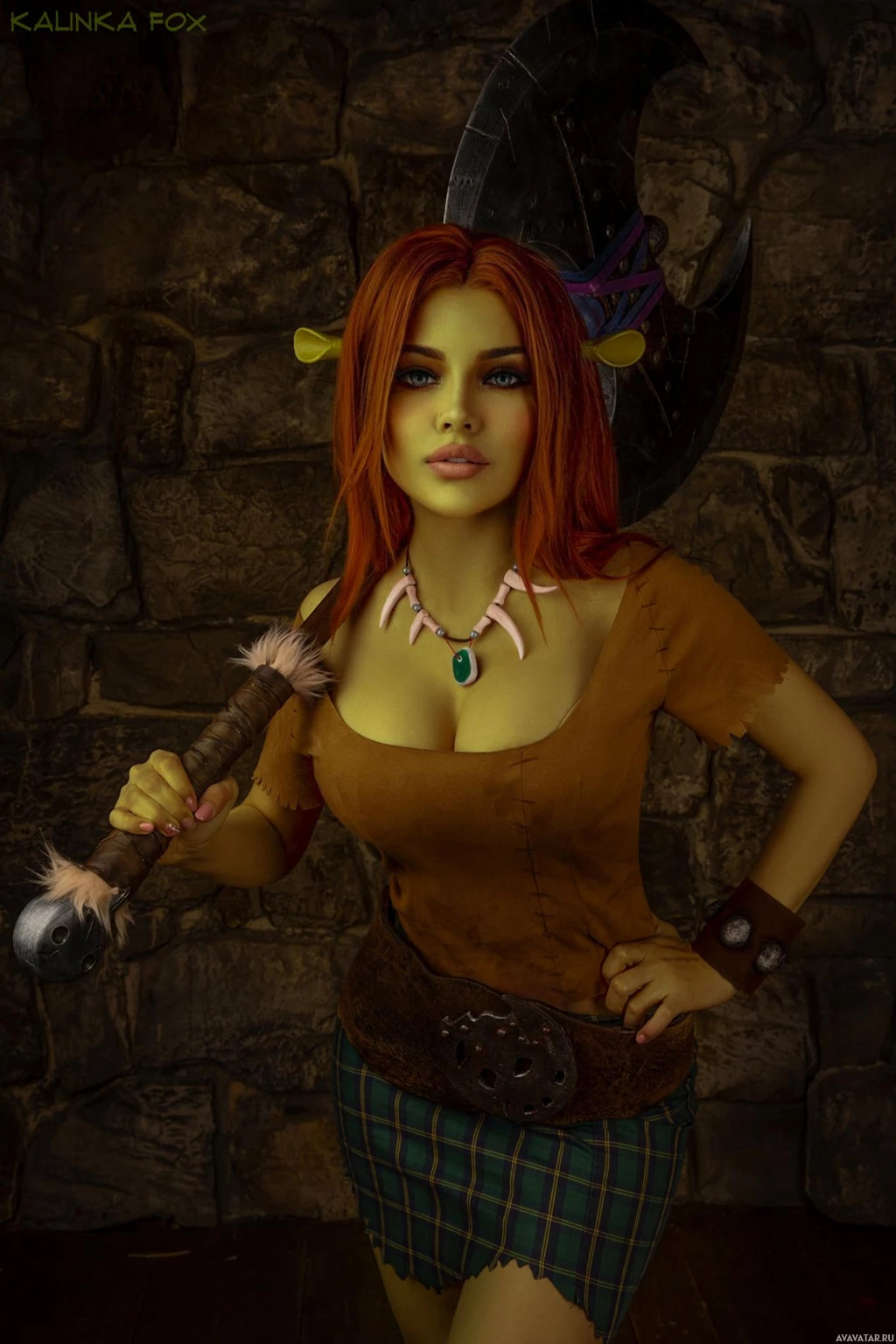 a female character who appears to be cosplaying as Princess Fiona from an animated movie. She is holding a staff and wearing a costume that includes elements such as