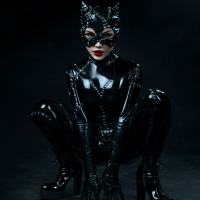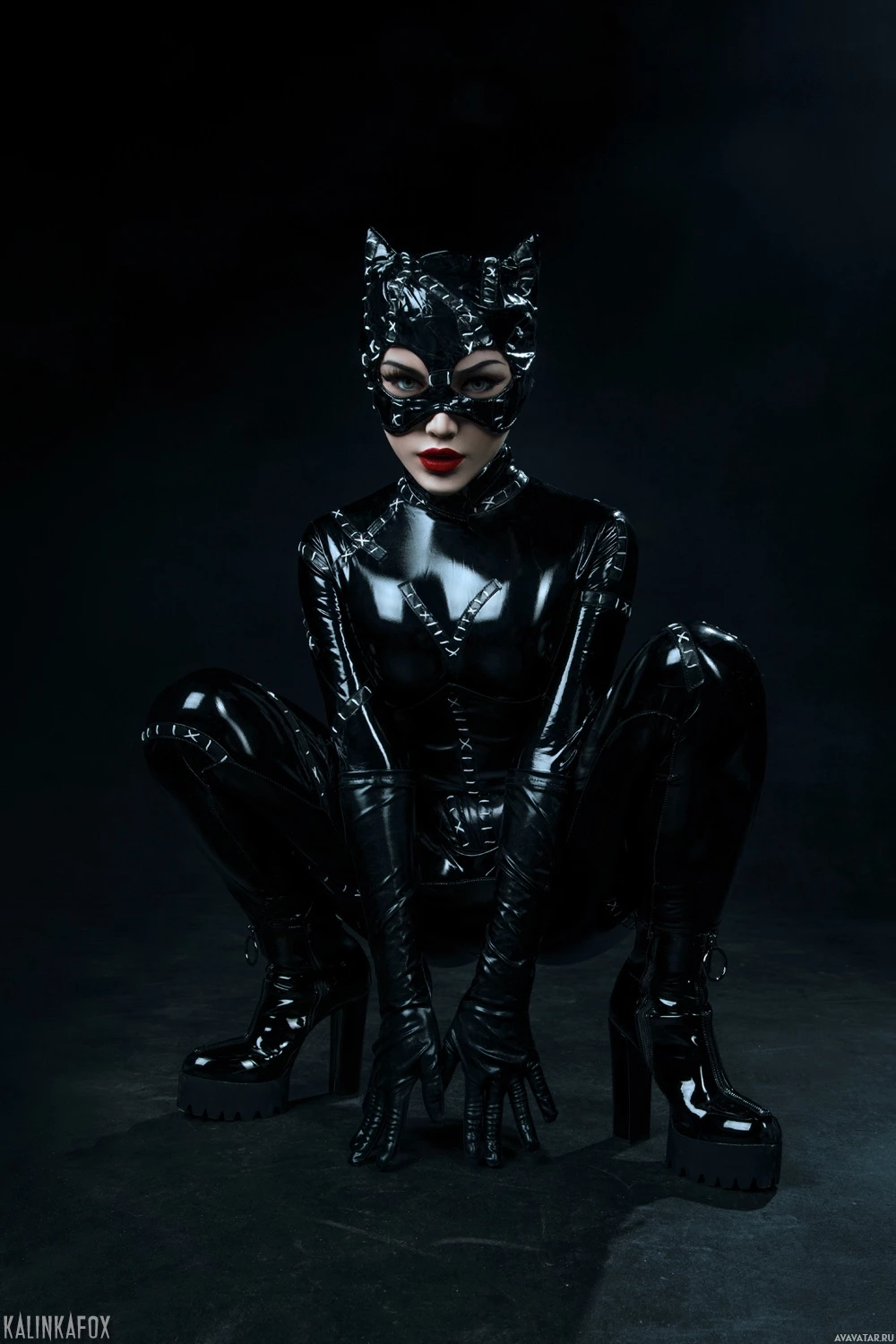 На картинке изображен человек, одетый в костюм женщины-кошки. Этот персонаж является частью франшизы о Бэтмене, его обычно изображают такие актрисы, как Джули Ньюмар или Мишель Пфайффер, в различных медийных адаптациях. Лицо человека, одетого в костюм, скрыто, и кажется, что он позирует в стилизованной манере, ассоциирующейся с образом персонажа комиксов.