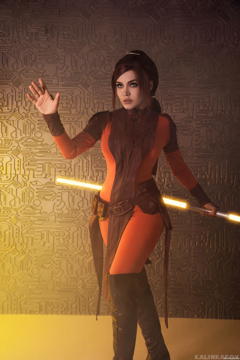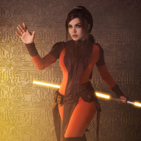 the Star Wars franchise. The individual is wearing red and black attire with boots, and is holding what looks like a lightsaber. They are also standing against a backdrop that resembles the surface of a planet or space environment, which is consistent with the setting in Star Wars films. The person's pose and expression suggest they are portraying