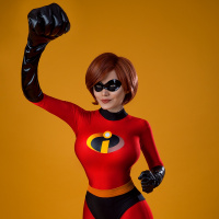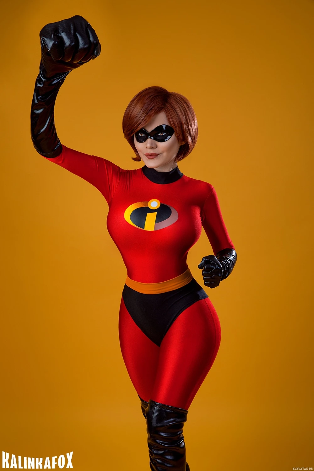 The image shows a person dressed in a red and white costume, resembling the character of Mrs. Incredible from