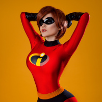 spiked hair. The costume is detailed, reflecting the design of Mrs. Incredible's suit from the film. This could be considered cosplay, which involves dressing up as a character from an animated movie or other media.