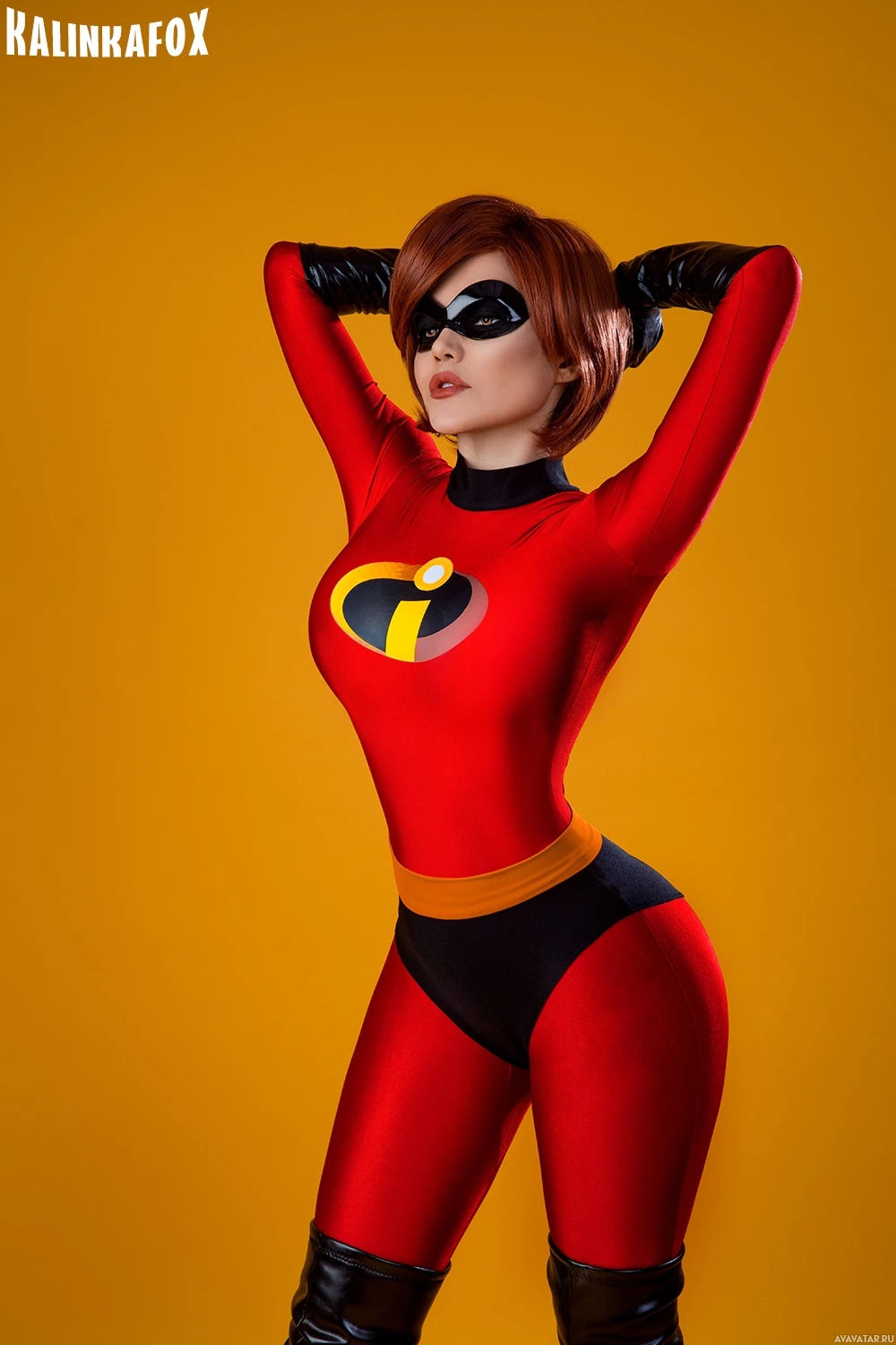The image shows a woman posing in a costume that is inspired by the character of Mrs. Incredible from