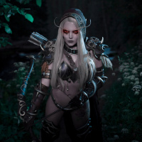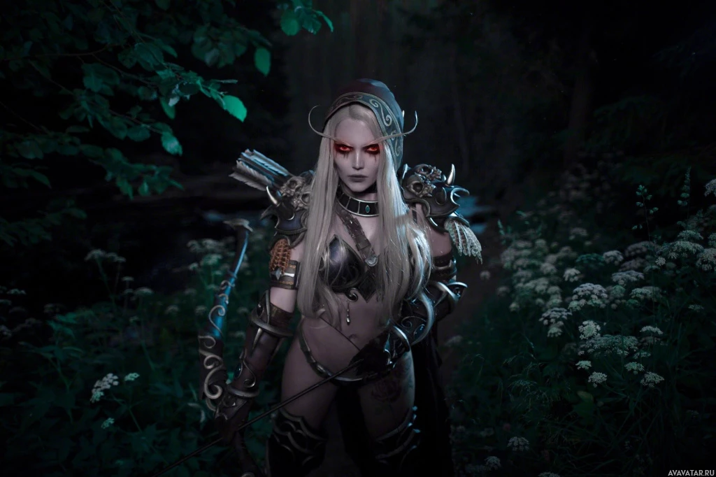 the video game "World of Warcraft" cosplaying as Sylvanas Windrunner, one of the major characters in the game. The character is portrayed with pale skin, long
