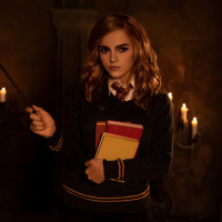 school uniform, which consists of a black robe with gold trim and a striped tie, along with round glasses and a wand in her hand. The setting appears to be a dimly