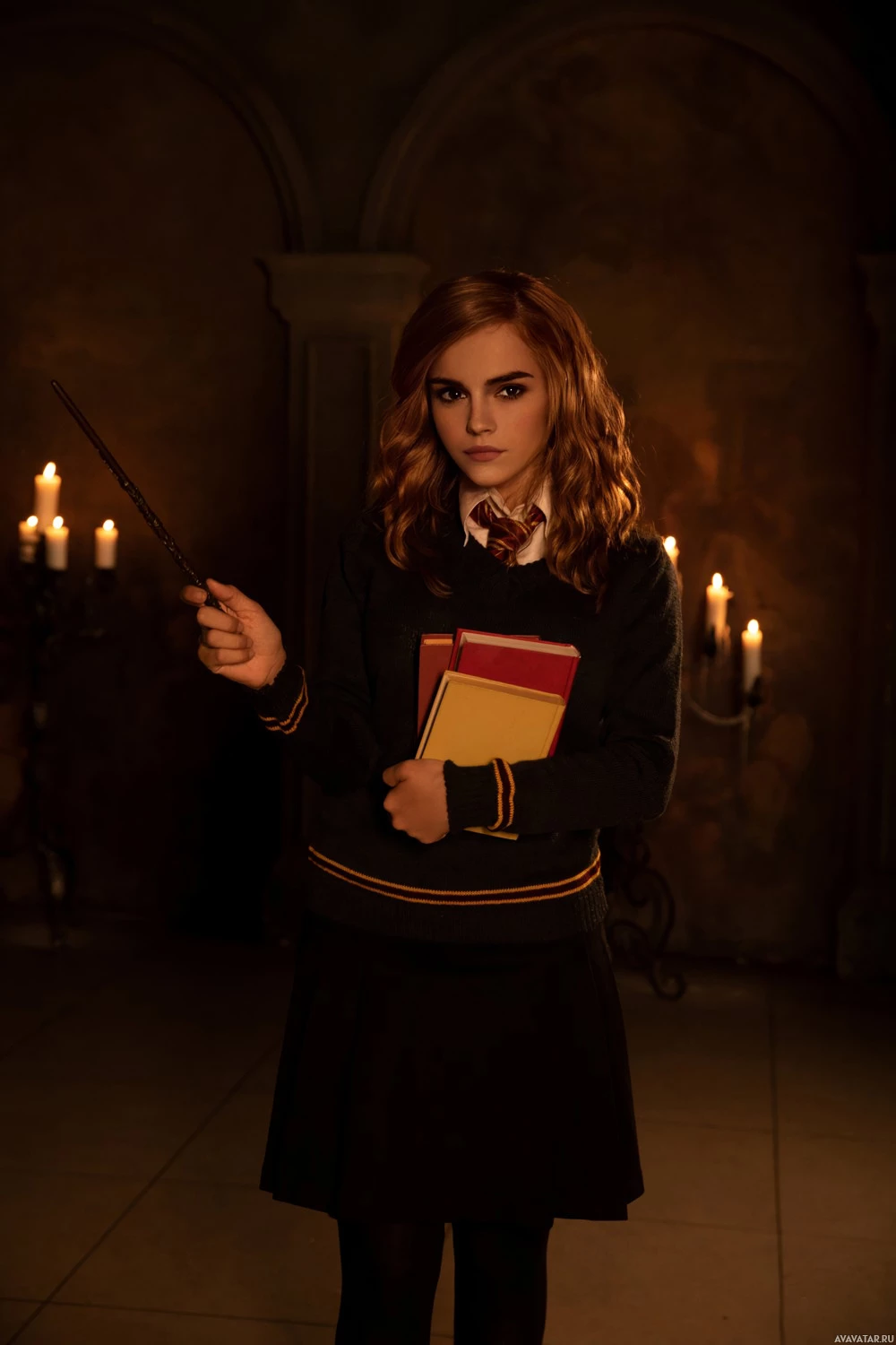The image shows a woman dressed in a costume, portraying the character Hermione Granger from