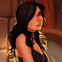 The image shows a stylized illustration of Yennefer, a character from the "The Witcher" series. She is depicted in