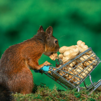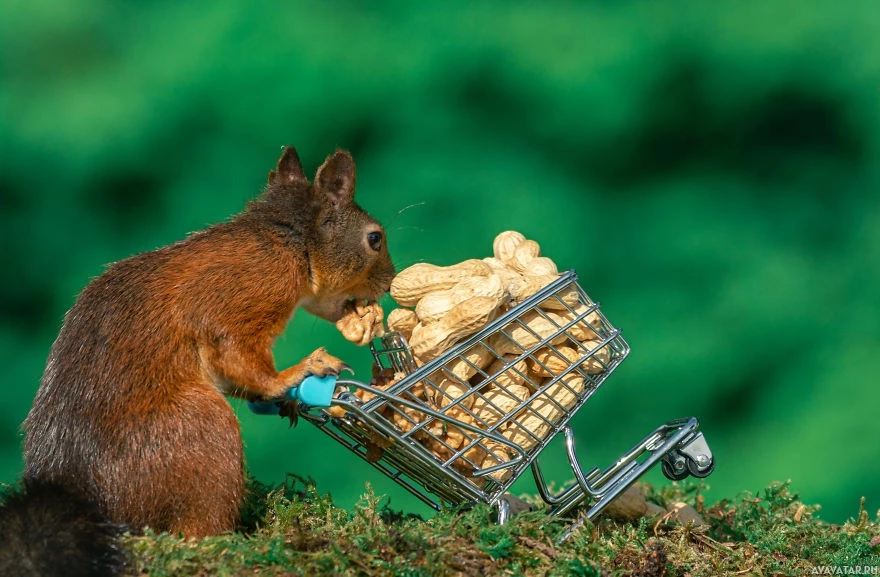 На картинке изображена белка, стоящая на задних лапах и толкающая пустую тележку для покупок. Это изображение отредактировано или обработано цифровым способом, поскольку такие животные, как белки, не могут выполнять такие действия без помощи человека.