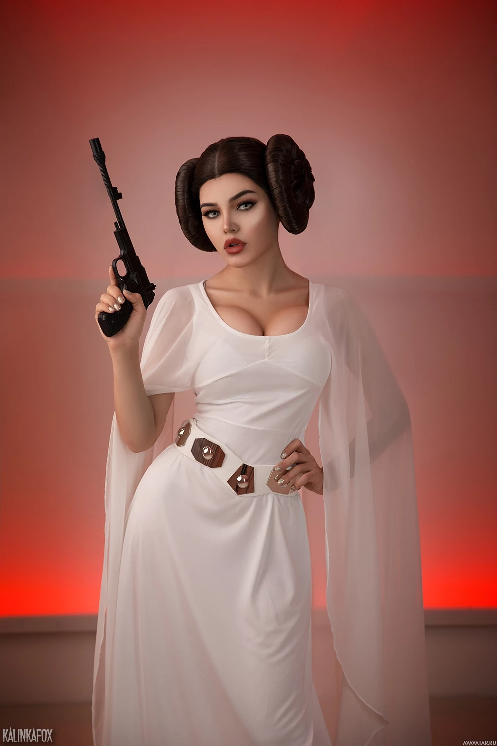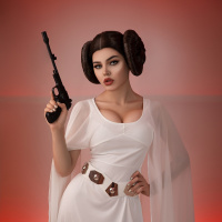 In the image, you can see a person dressed in a costume that resembles Princess Leia Organa's iconic attire from the "