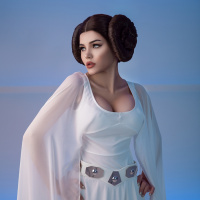 The image features a person dressed in a costume that resembles the attire of Princess Leia Organa from