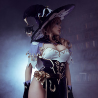 the video game "Genshin Impact." She is wearing a costume that includes a black and purple dress, a witch's hat with