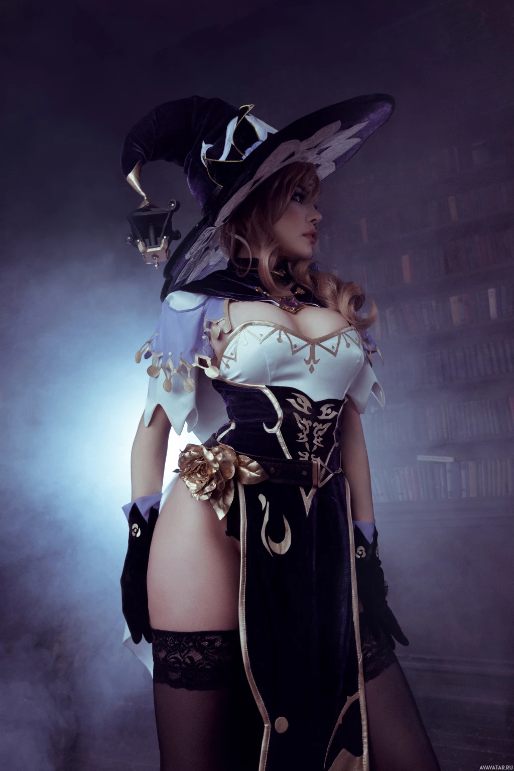 a moody atmosphere with fog and bookshelves filled with books, which adds to the fantastical theme of her costume.