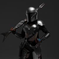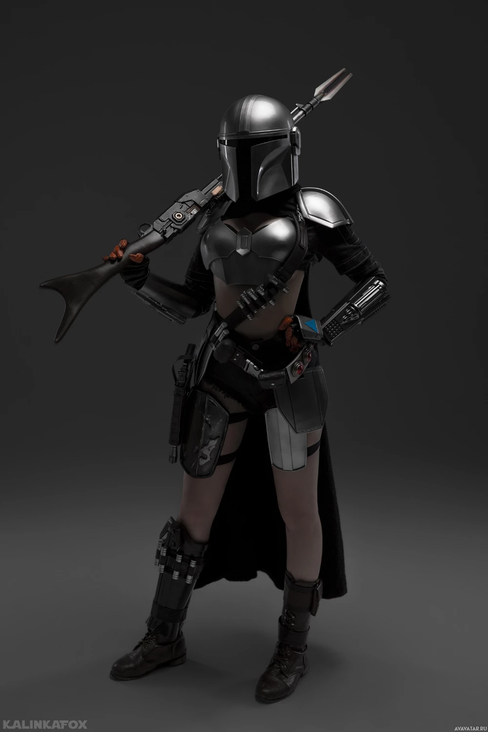 The image shows a person dressed in cosplay as the Mandalorian, a character from