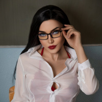 a desk lamp in the background. Her pose suggests a relaxed or seductive demeanor.