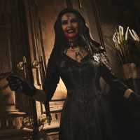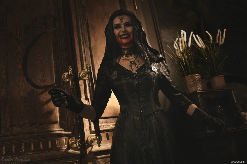 video game series, specifically dressed as Dimitrescu's Daughter, which is a known cosplay of this character. The character is portrayed in a dark,