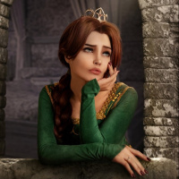 a green dress with a medieval design, and their hand is on their chin, giving an expression that suggests concern or worry. Behind them is