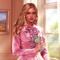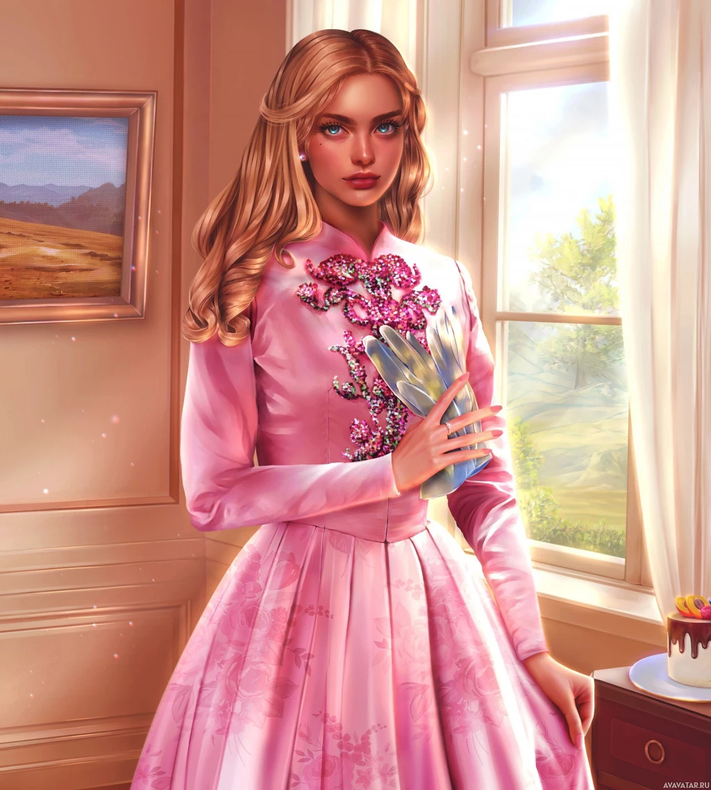 pink dress with a floral pattern and is holding what appears to be a pair of shoes in her hands. Her hair is styled in long,