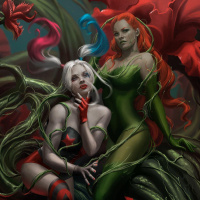 Poison Ivy is on the right, dressed in her classic green and black vine-like suit. They are sitting together amidst a lush