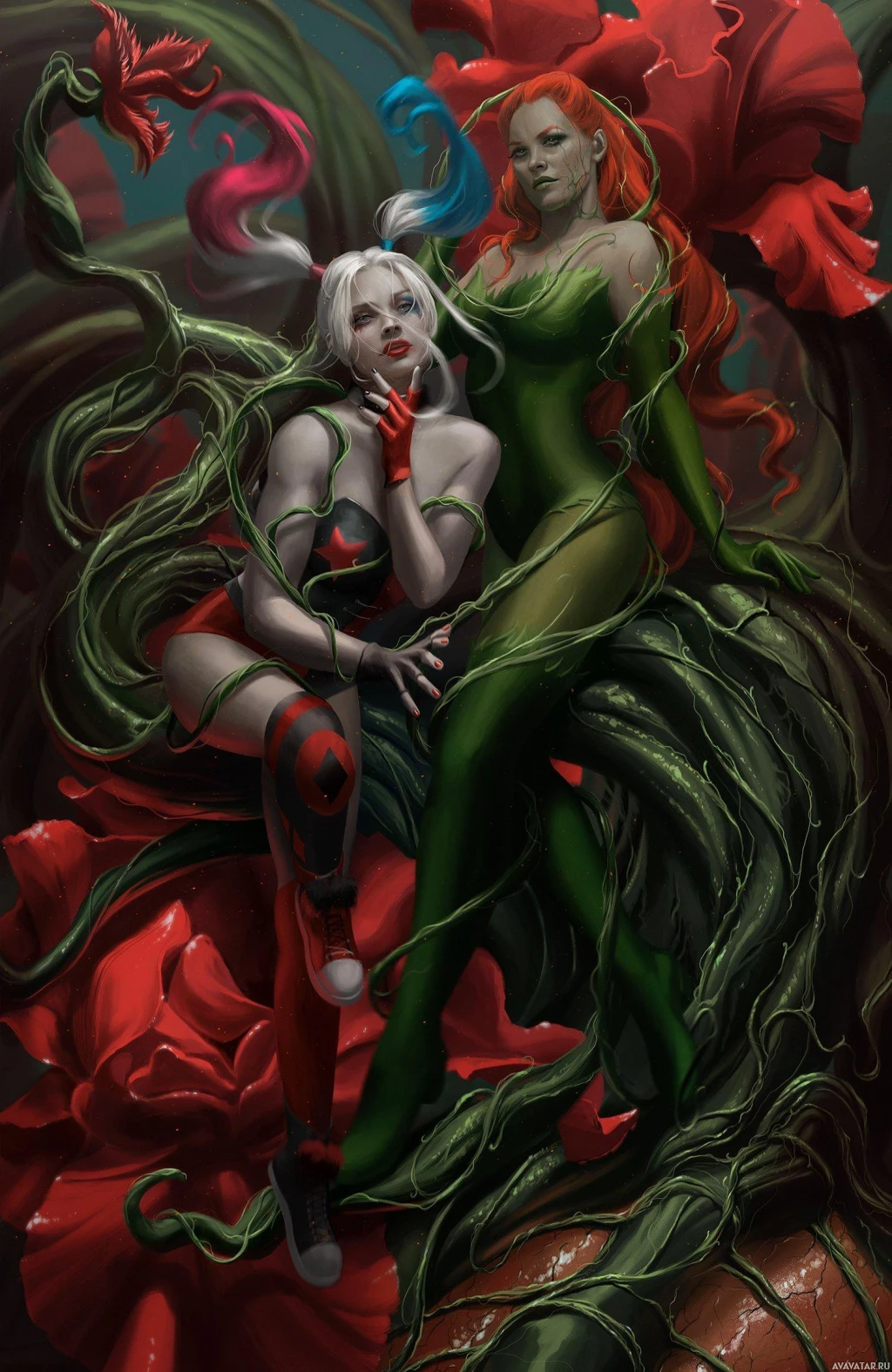 Harley Quinn and Poison Ivy. Harley Quinn is on the left, wearing her iconic costume with a baseball bat motif, and