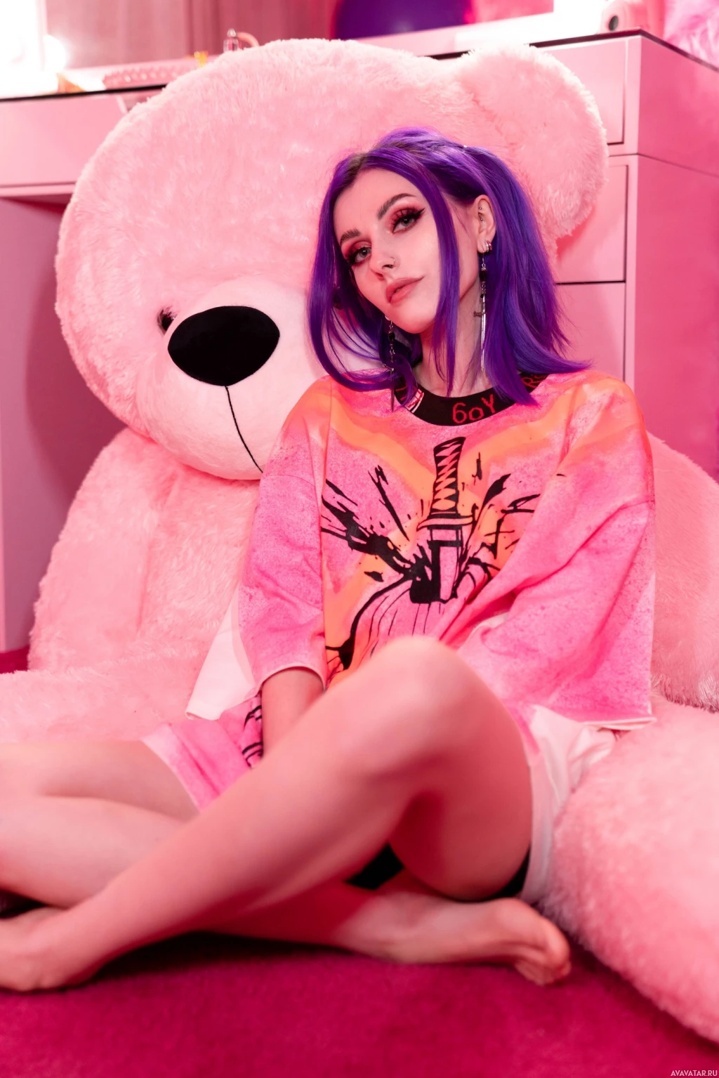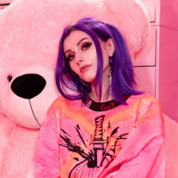 purple hair and is wearing what appears to be a colorful t-shirt with various designs on it. They are looking directly at the camera with