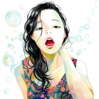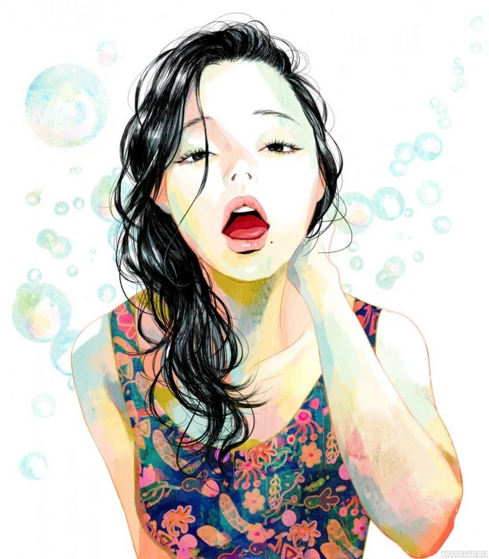 a bubbly substance that might be part of a bath, given the soap-like foam and the fact that she is wearing a swimsuit. The color palette is soft with