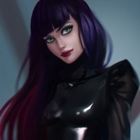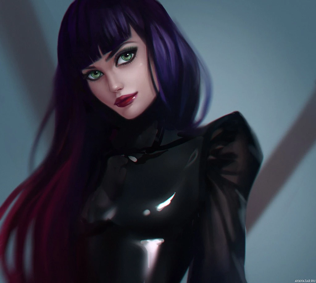 purple hair. She has striking green eyes, which is quite unusual in