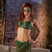 studio space. The woman's pose suggests she might be portraying Poison Ivy in a dynamic fashion, which could be for a photoshoot,