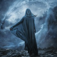 dark robes with a hood. The individual appears to be standing at the edge of a rocky or volcanic cliff, looking out towards an ominous sky filled with clouds and possibly suggesting