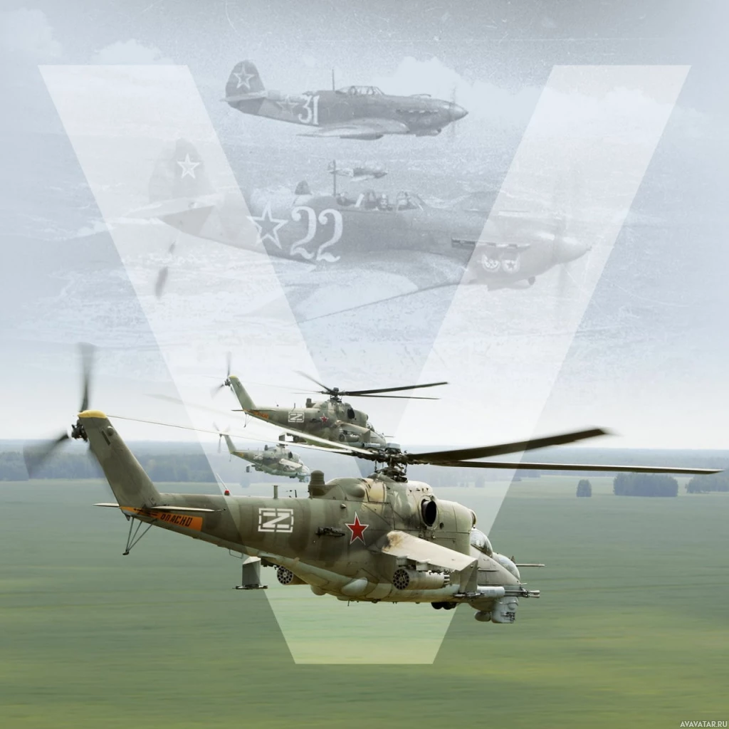 military aircraft, with an emphasis on helicopters. In the foreground, there is a modern Mi-8 helicopter. Behind this helicopter there are two World War II era aircraft from the Soviet Union, which appear to be