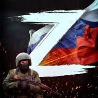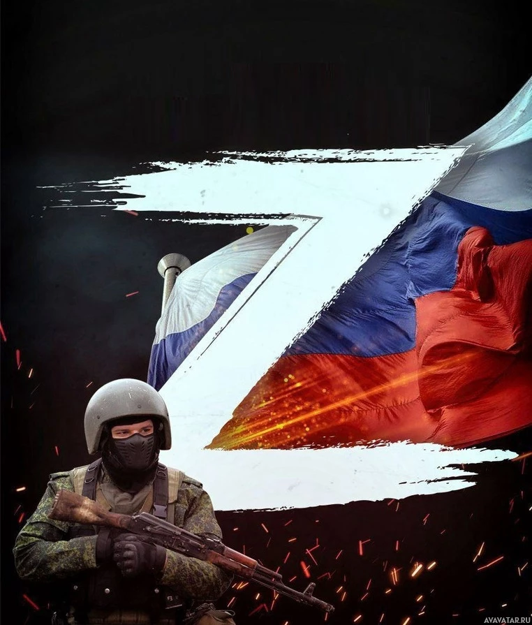 battle setting. The flags behind the soldier appear to be those of Russia (white, blue, and red