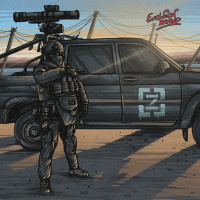 protective gear such as a helmet with visor, which suggests they are equipped for combat or field operations. There's a desert-like environment around them, possibly suggesting a deployment in
