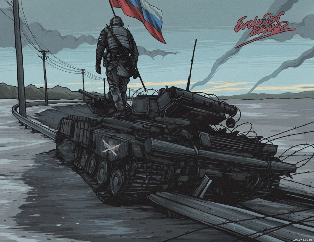 the Russian military, standing behind a tank. The setting appears to be an industrial or war-torn environment, possibly during twilight or dawn given
