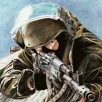 The image depicts a soldier from the Russian army, wearing camouflage gear and holding a weapon that appears to be a sniper rifle. The artwork showcases a realistic portrayal of this individual, likely representing readiness or vigilance in their role as a military personnel.
