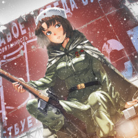 a military uniform, specifically what appears to be a Russian army soldier's outfit. She is wearing a helmet and holding a rifle, which adds to the impression of being part of