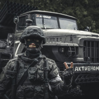 The image depicts a soldier from the Russian army standing in front of a military truck. The soldier is wearing camouflage gear, including a helmet and a vest with protective gear. There's also text that reads "В активном поиске". The setting appears to be outdoors with natural surroundings visible in the background.