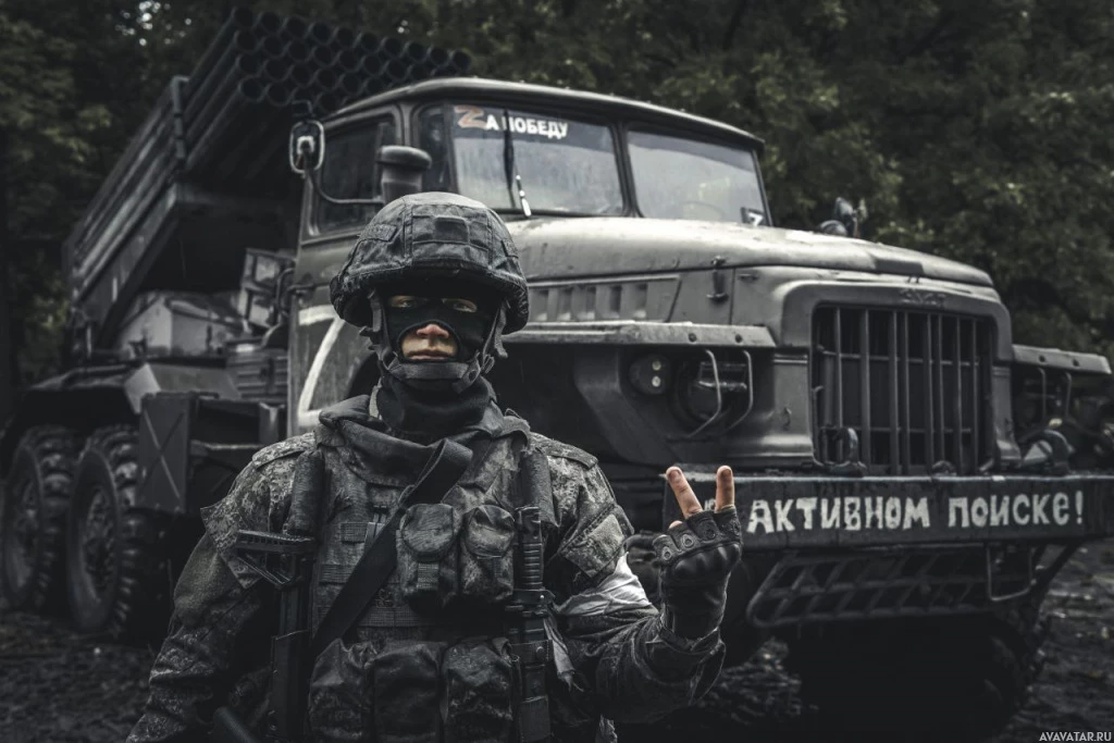 На картинке изображен солдат российской армии, стоящий перед военным грузовиком. Солдат одет в камуфляжную форму, включая шлем и жилет с защитным снаряжением. Также есть тест с надписью "В активном поиске". Действие происходит на открытом воздухе, на заднем плане видна природа.