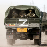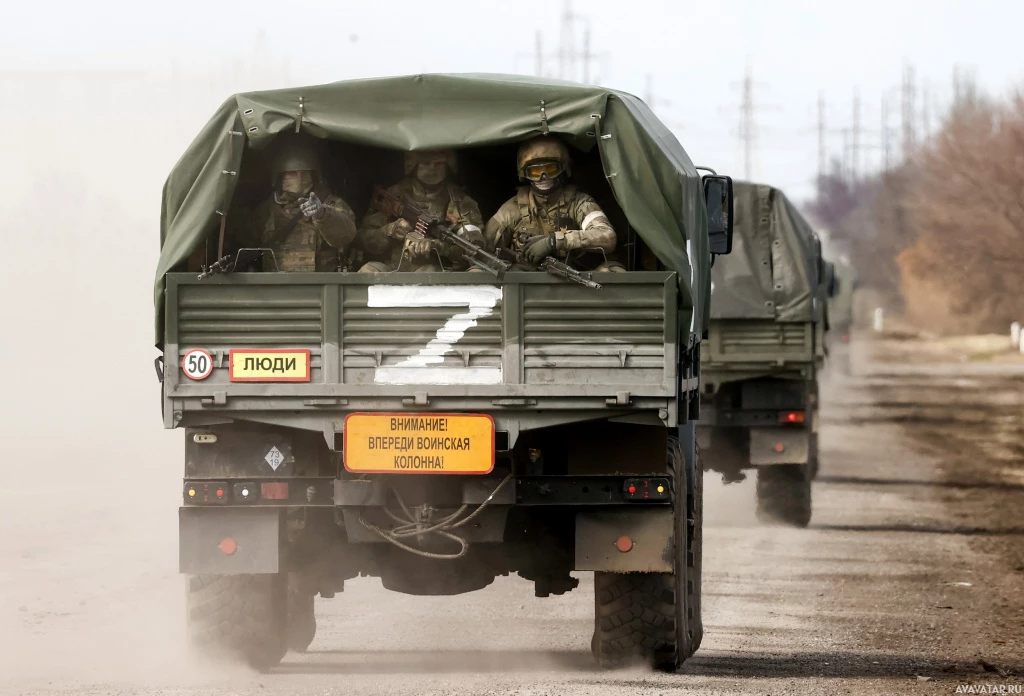the Russian army, traveling in military vehicles. The trucks appear to be armored personnel carriers or similar transport vehicles designed for