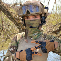 The image shows a person dressed in military camouflage gear, including