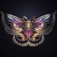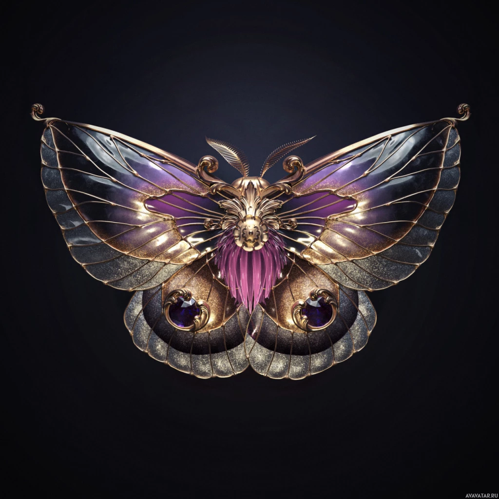 intricate patterns on its wings and body, with colors like purple, gold, and silver. There are also what appear to be gears or