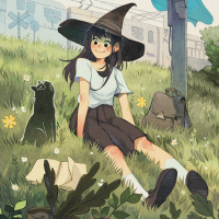 a witch hat and has a smile on her face, suggesting she's having fun or engaged in a playful activity. Next to her sits