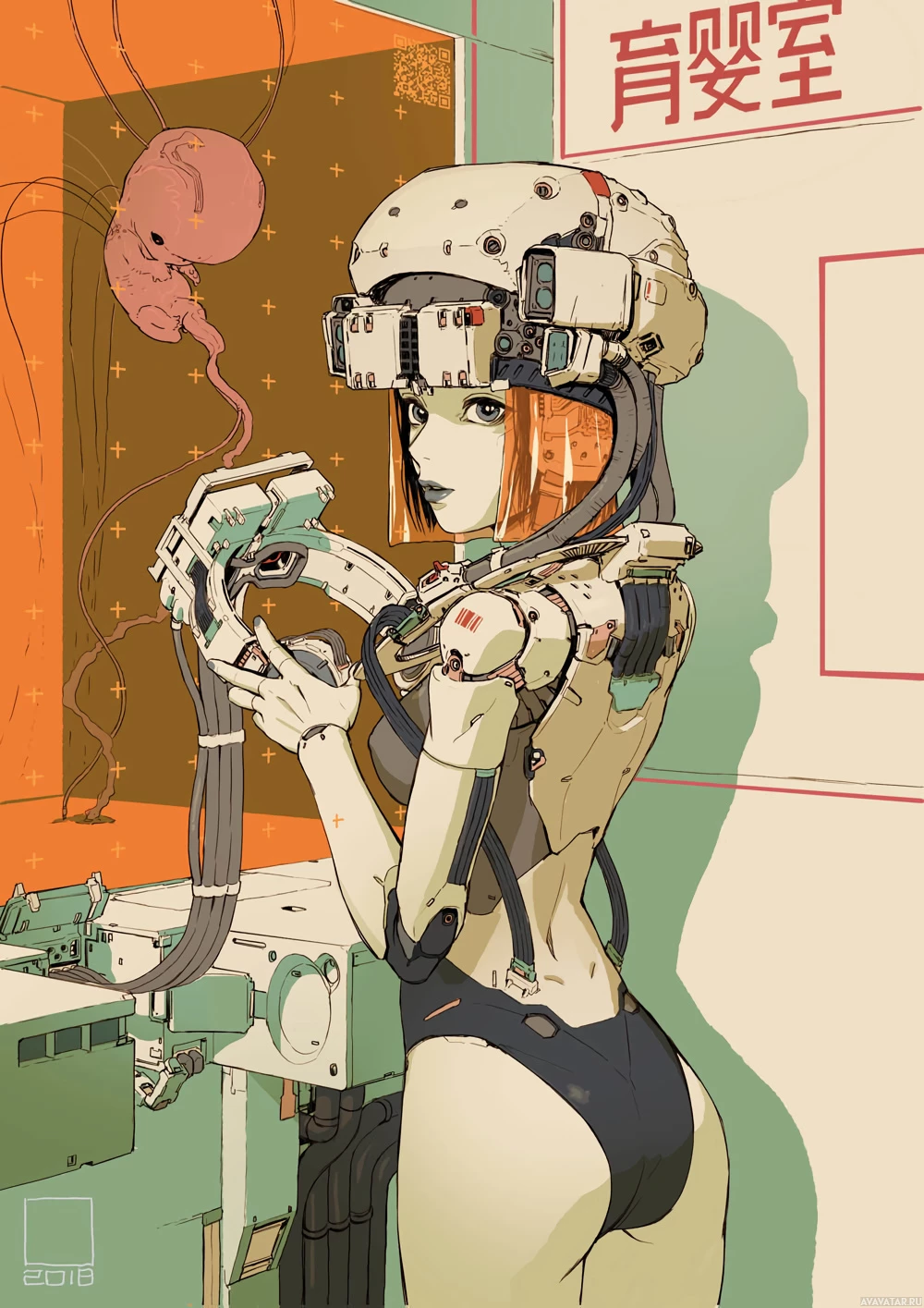 workshop setting, given the industrial equipment and pipes around her. Her design suggests she might be