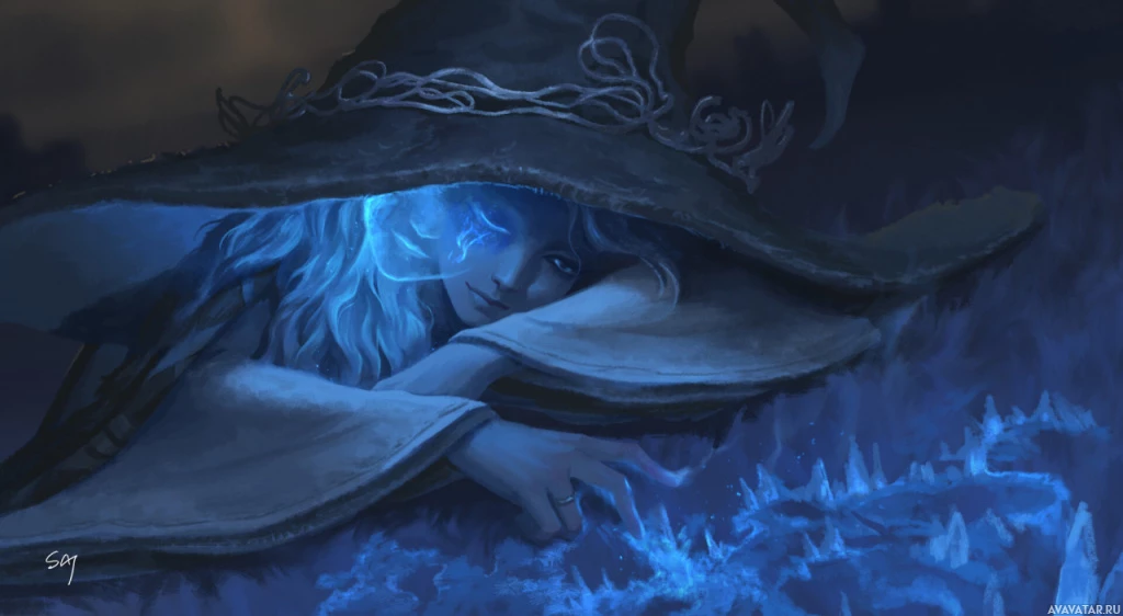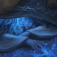 brimmed hat, with an ethereal blue glow illuminating her face. Her expression seems contemplative or perhaps melancholic. The background suggests a mystical or otherworldly setting with starlight twinkling above her.