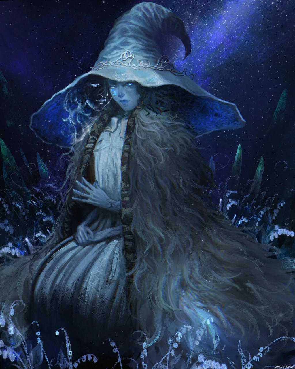 the video game Elden Ring, known as Ranni the Witch. She is sitting on a rock with her hands clasped together and has