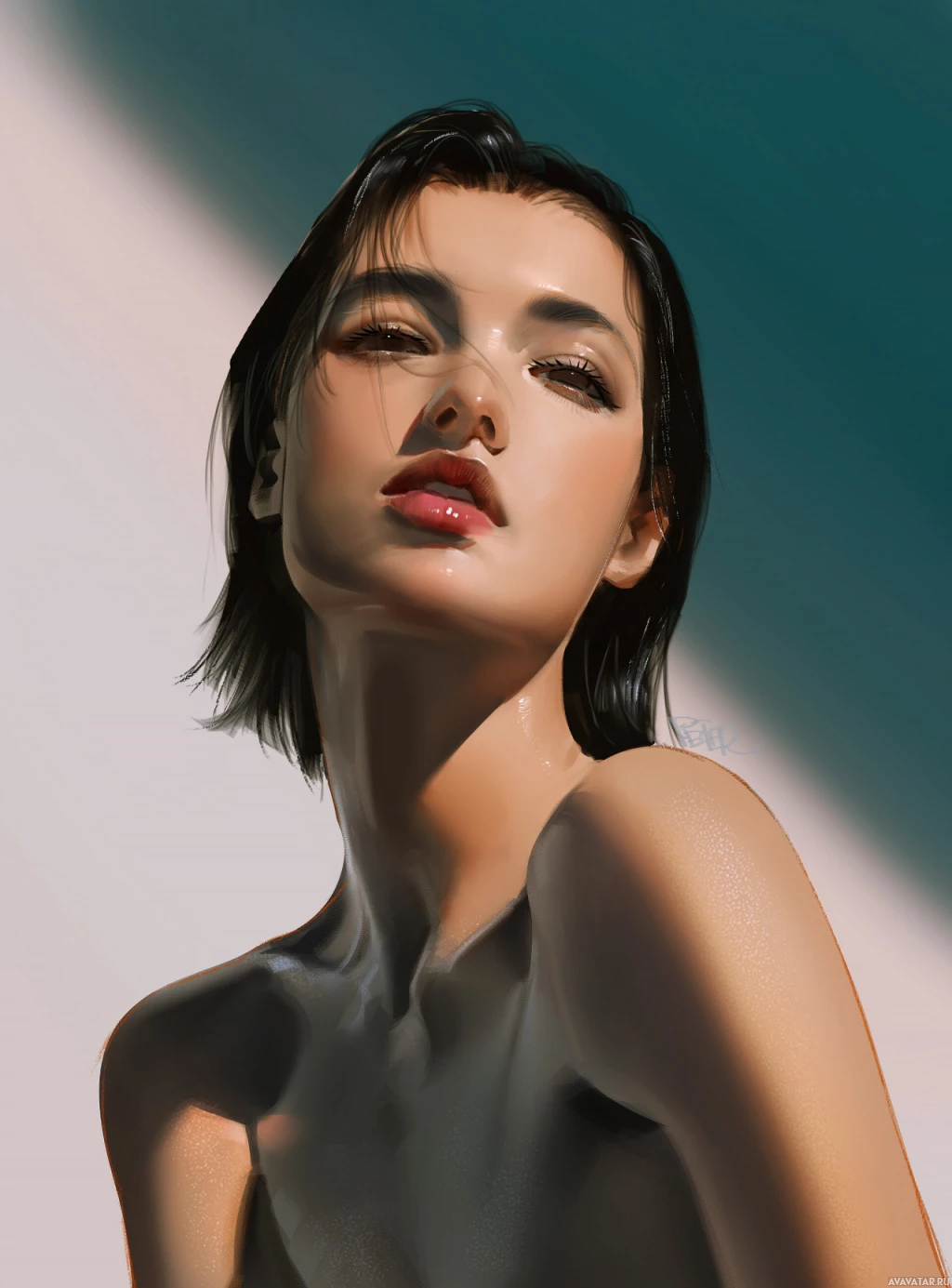a serious expression on her face and is looking slightly to the side, away from the viewer. Her skin appears smooth, and she seems to have been outdoors due to the presence of what looks like water or oil glistening on her neck and shoulders. The lighting in the image gives it an ethereal quality, with