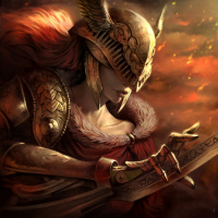 the video game "Elden Ring," named Malenia. She is depicted in a powerful and menacing pose, wearing armor with a helmet that has wings on it, which gives her an intimidating appearance. She is holding