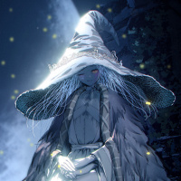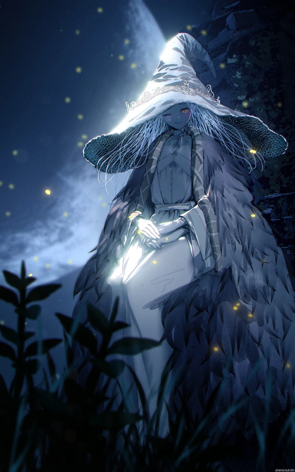 a magical setting with moonlit scenery and glowing lights. Ranni is wearing
